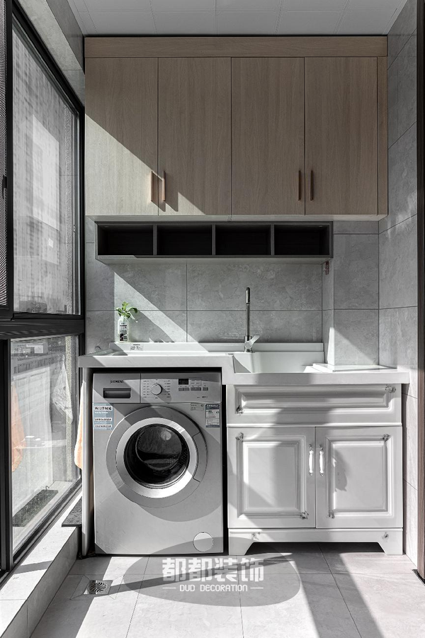 阳台采光充足,木制吊顶的设计简朴时尚,油然而生一种田园的惬意感,绿植的点缀让空间充满生机勃勃,墙面、地面、洗手台的完美组合,颜值想不高都不行。