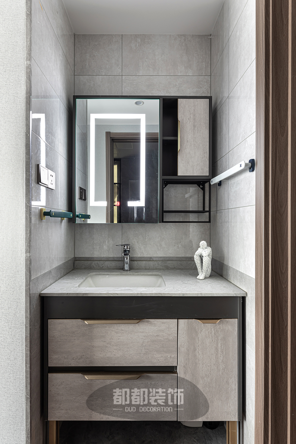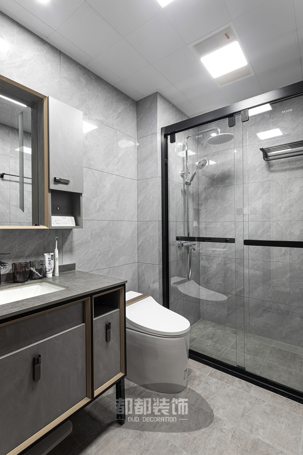 卫生间采用干湿分离,融合简单富有肌理感的岩板简单利落的的灰色大理石迟壮等元素来提升空间气质,现代有格调,给人带来眼前一亮的视觉效果,电热毛巾架、镜柜、智能马桶的利用,大大提升生活格调。