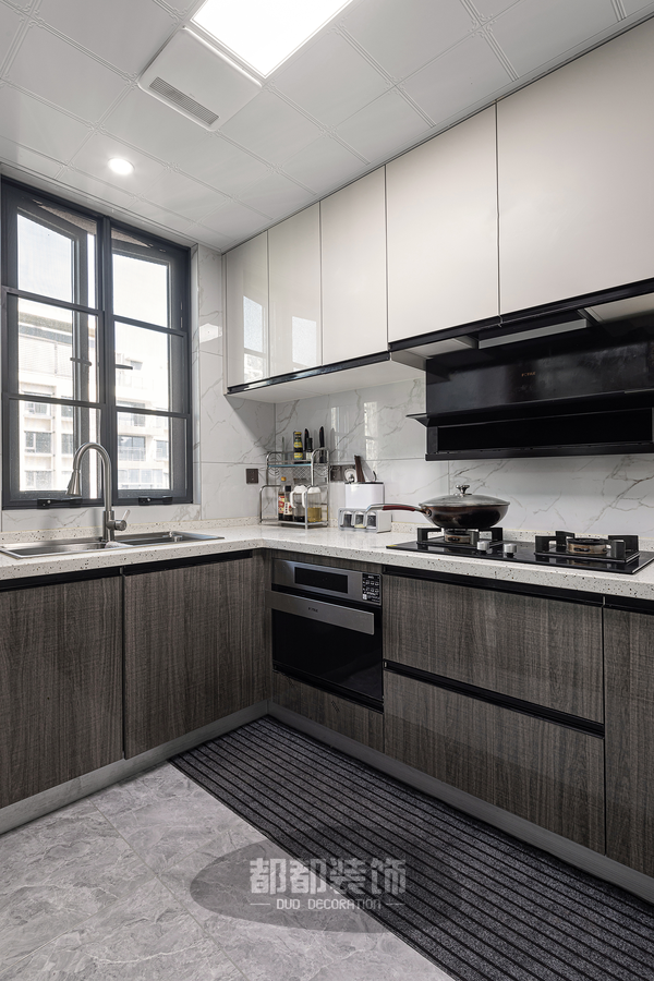 厨房的设计与选材追求完美的品质,岩板+大理石的搭配更显轻奢格调,吊柜与地柜分别用了银岩灰与绅士灰,一深一浅,巧妙的达到了和谐又对比的效果。