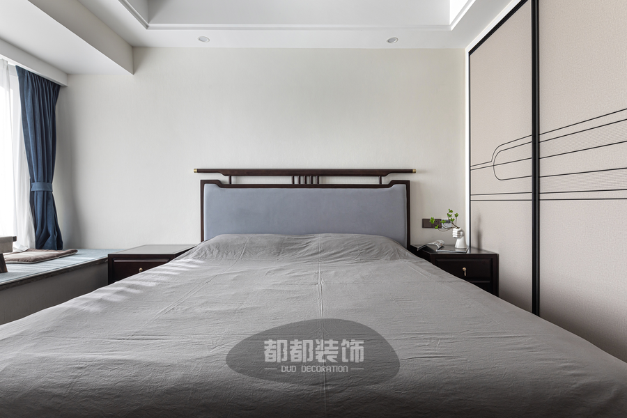 老人房的设计以简约大气为主,室内以灰蓝白三色为主,色彩雅致而古朴,床头设计造型优美,利落的线条流畅地表达出传统文化中的精髓。