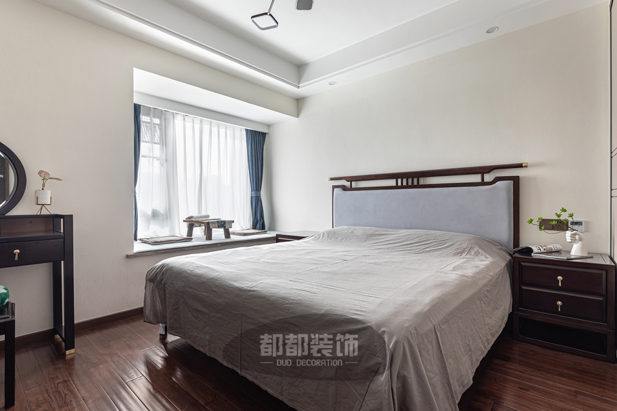 婉约别致的古典元素与现代美学结合碰撞出了不一样的格调高雅,深蓝的背景墙点缀金属花纹,静谧时尚;实木地板温润自然,在简洁大气的硬装基础上搭配富有情趣的壁灯、古典的床头柜,营造出古韵十足又不失高雅情调的居住氛围。