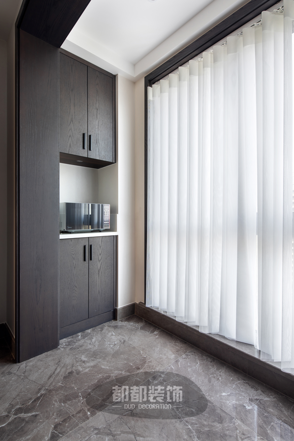 沙发后规划出了创意感十足的岛台,成为了女主人最喜欢的下厨地方,也成为了家庭里最亮眼的互动区域,旁边是一个独立出的小阳台,做了吊柜,满足一些简单的厨具储藏功能。