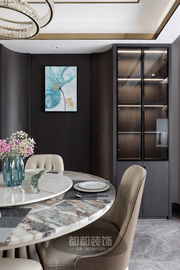 餐厅延续了客厅低调奢华的主格调,没有过于繁杂的装饰,但细节之处精致又时髦,皮质的四椅一桌高档舒适,干花温馨不失烟火气,充满了一日三餐的仪式感。