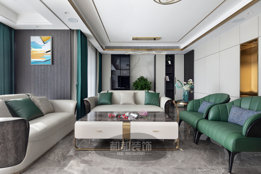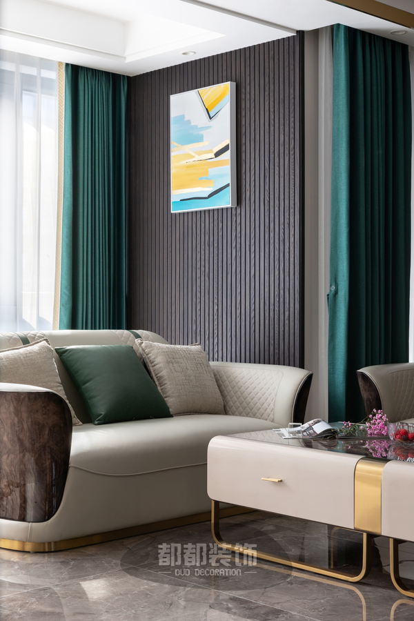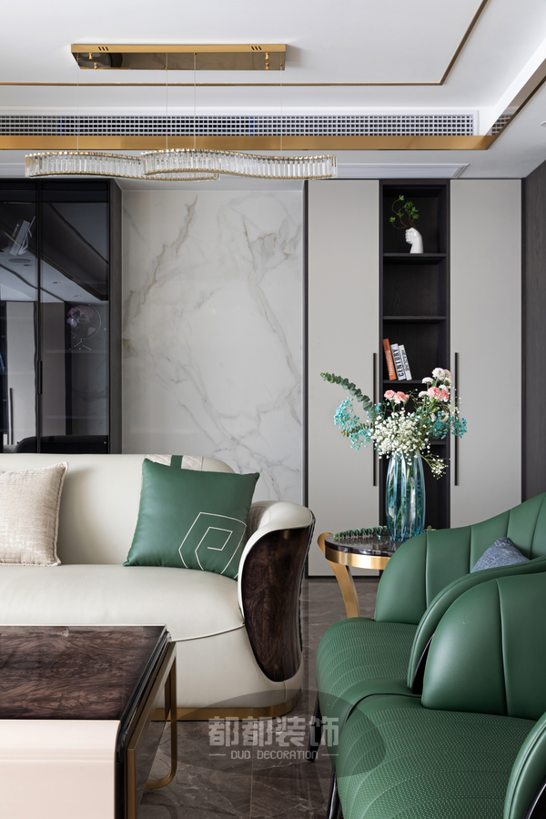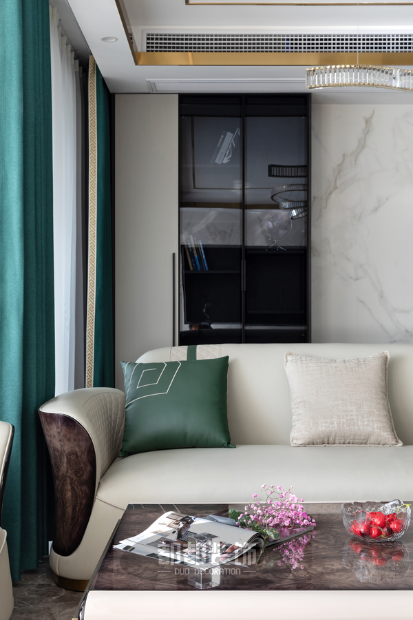 客厅空间简繁相适,大理石背景墙温润如泽,黑色木饰面素雅质朴,营造出温馨华丽的空间气质,轻奢细致的软装布置和金属、丝绒、皮质等现代材质的组合展现,低调不落俗套,墨绿色沙发高级优雅,让客厅的色彩不再单调,显露出奢华而不简单的感觉。