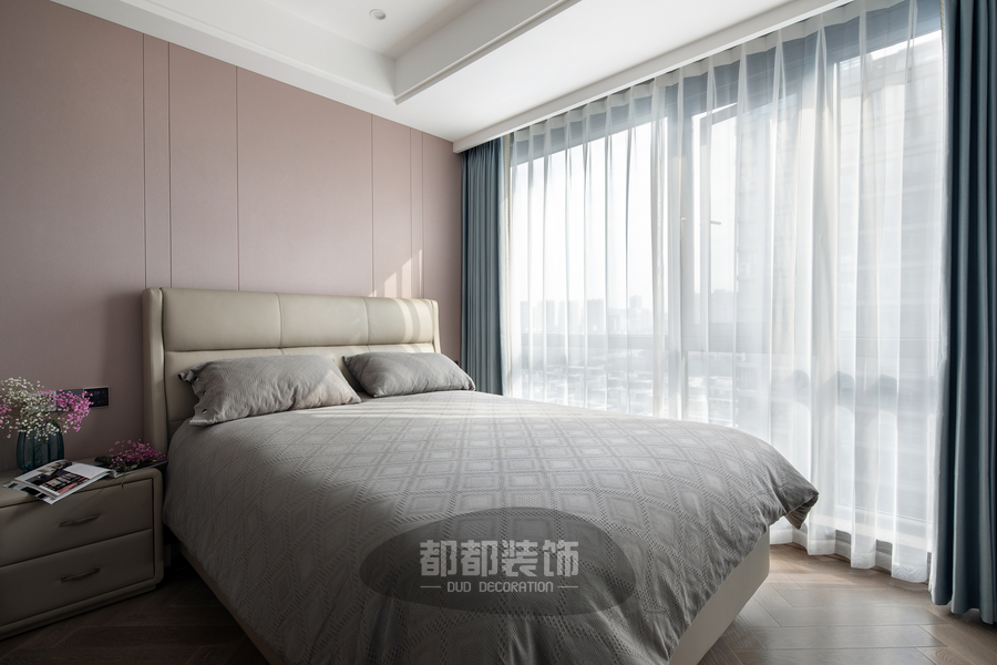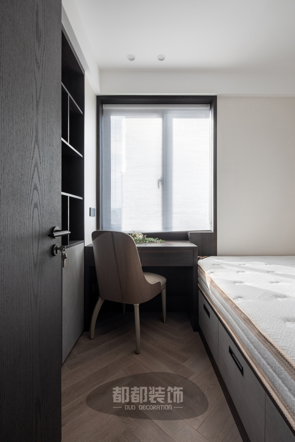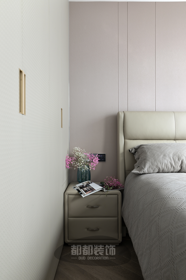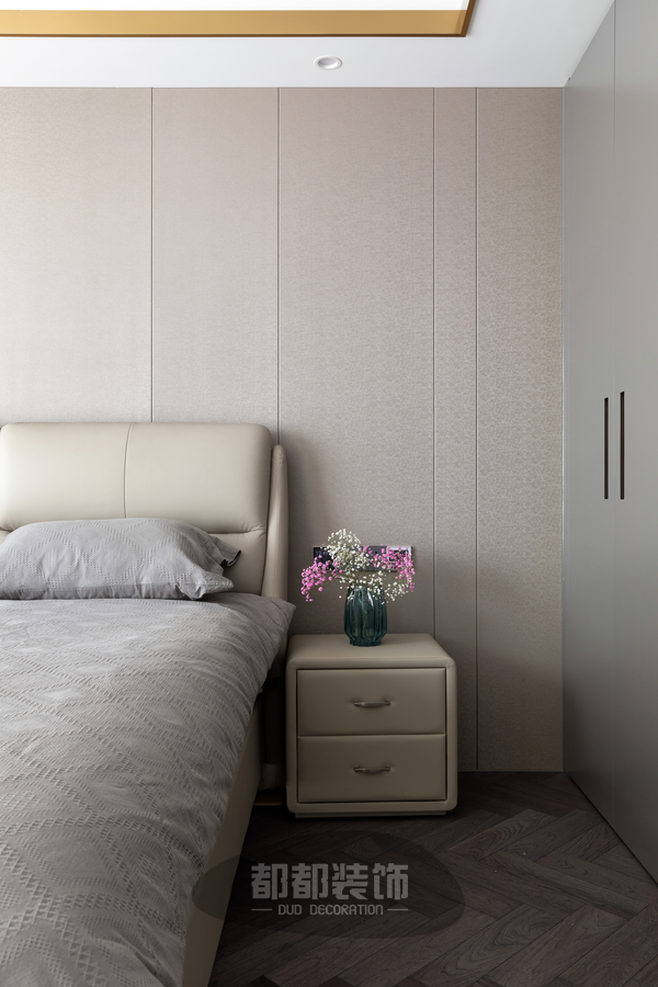 米白色的嵌入式柜体收纳高效且精致简洁,包头床与床铺形成自然细腻的层次过渡,结合清新自然的干花,在为空间添加了一丝浪漫的同时,也将高级灰的低调优雅发挥到极致。