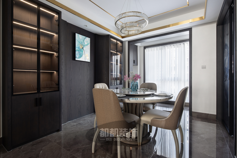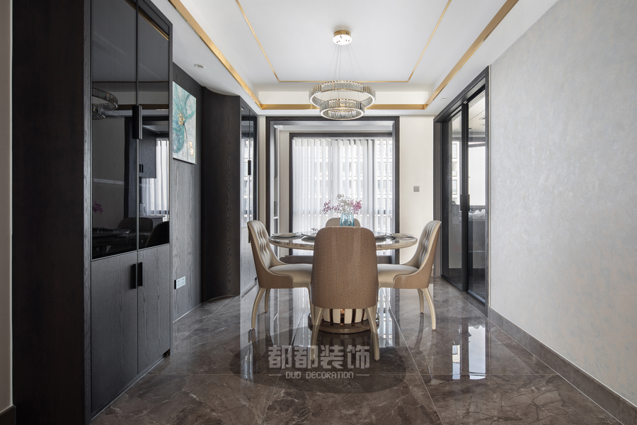 餐厅依偎着厨房,侧边做了实木酒柜,再搭配玻璃门,名酒摆放其中,在藏露遮掩之间,给人以低调奢华质感,酒柜内部内置隐藏灯带,通透明亮,衬的酒柜精致美观,成为餐厅内让人赏心悦目的一景。