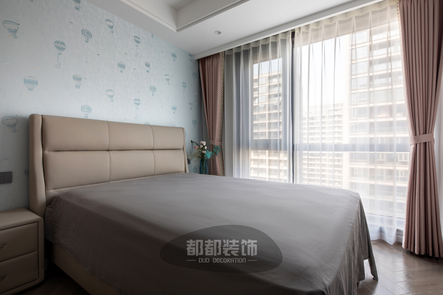 次卧是孩子在住,淡蓝色的墙面为空间增添了几分温馨俏皮之感,素雅的窗帘、实木地板、咖色软包床,简约自然,床头点缀小株的绿色植物,阳光照耀下更显得生机满满。