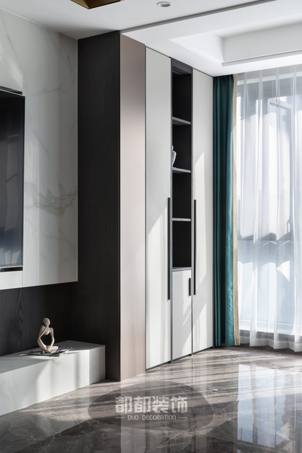 电视墙一旁是嵌入墙体的储物柜,整体为空间增添了不规则的层次感,时尚的浅色储物柜内部掏空,可供摆放艺术摆件,在满足储物功能的同时也传达出了主人个性的时尚品味。