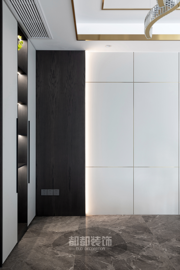 玄关背景用了奢石,纹路错综复杂,花色百变相互辉映,仿佛一条斑斓华美的金色银河,两侧过道的门套用了大理石,大气高级,整体玄关的设计为家增添了无数瑰丽梦幻 。