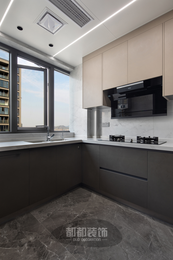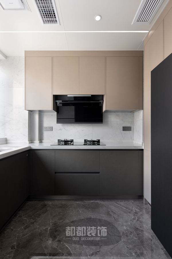 厨房是现代简约风格,金黑色搭配,简洁中带着现代高级的质感,既时尚又有扩大空间的效果。