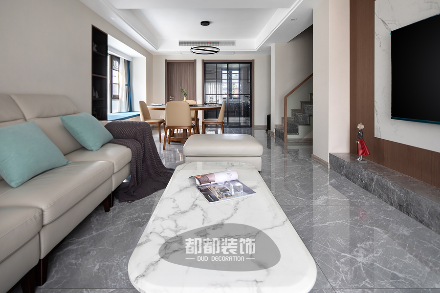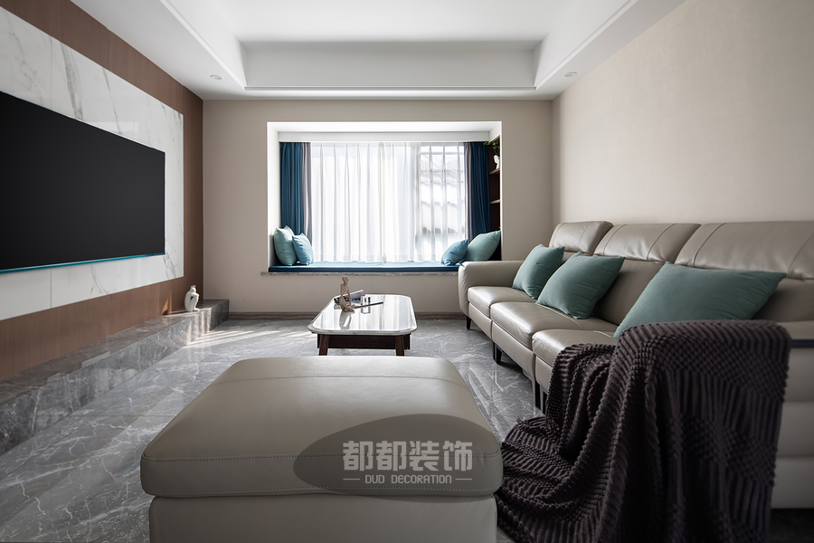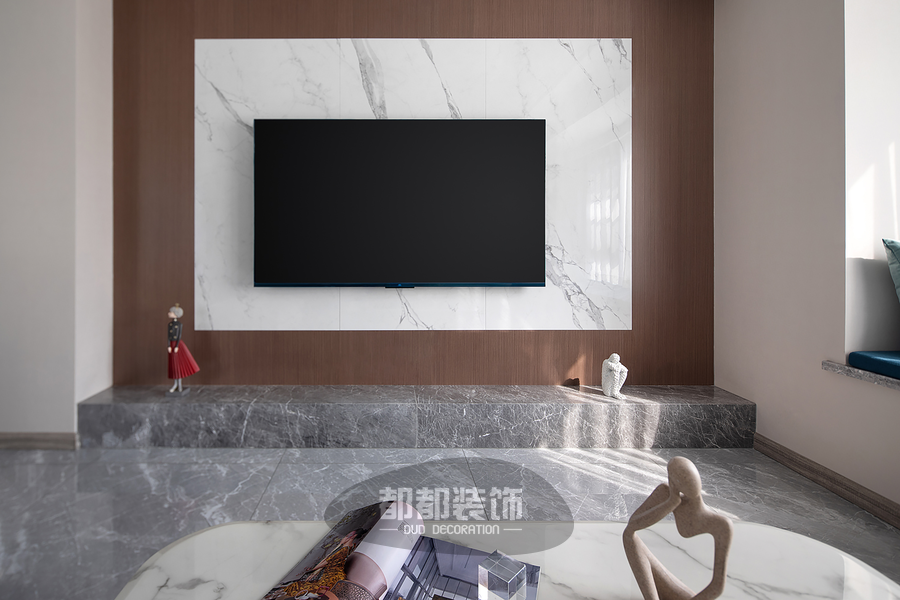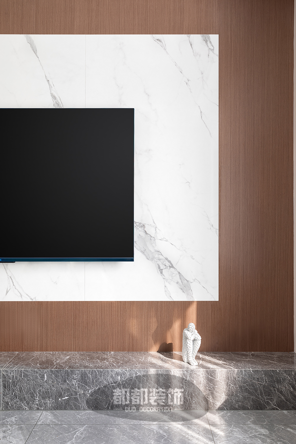 电视墙黑白色搭配凌厉不啰嗦,木饰面清新雅致,整面造型更显年轻有格调,同材质绅士灰大理石台面,可以摆放一些艺术摆件,增添了空间的趣味性和层次感。