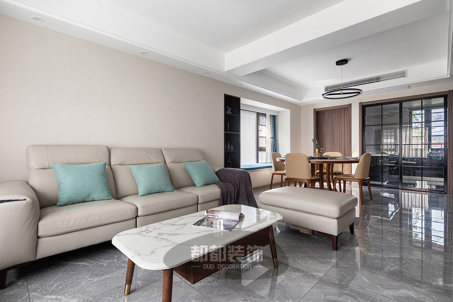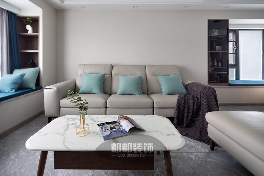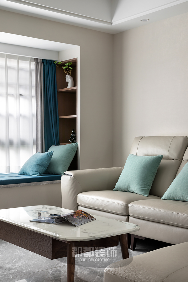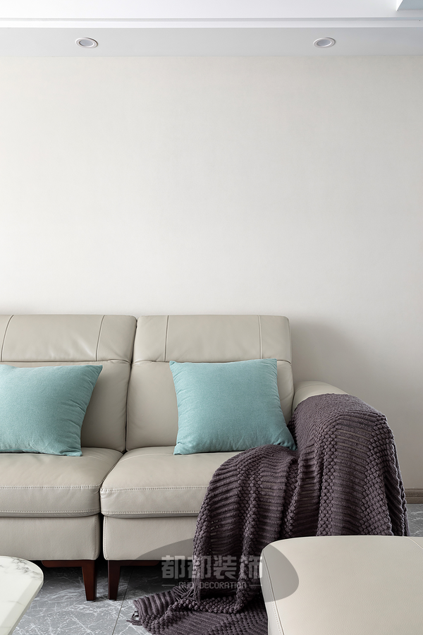 阳台透过落地窗融入客厅,保证了屋内充足的采光,整个空间内的软装设计偏简约大气,浅灰色的皮质沙发优雅禅意,小巧的岩板茶几,不经意布置的绿植,随意翻开的杂志,几缕跳跃的阳光,充斥着主人对生活无比的赤城,温馨舒适。