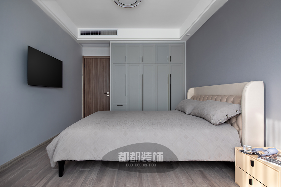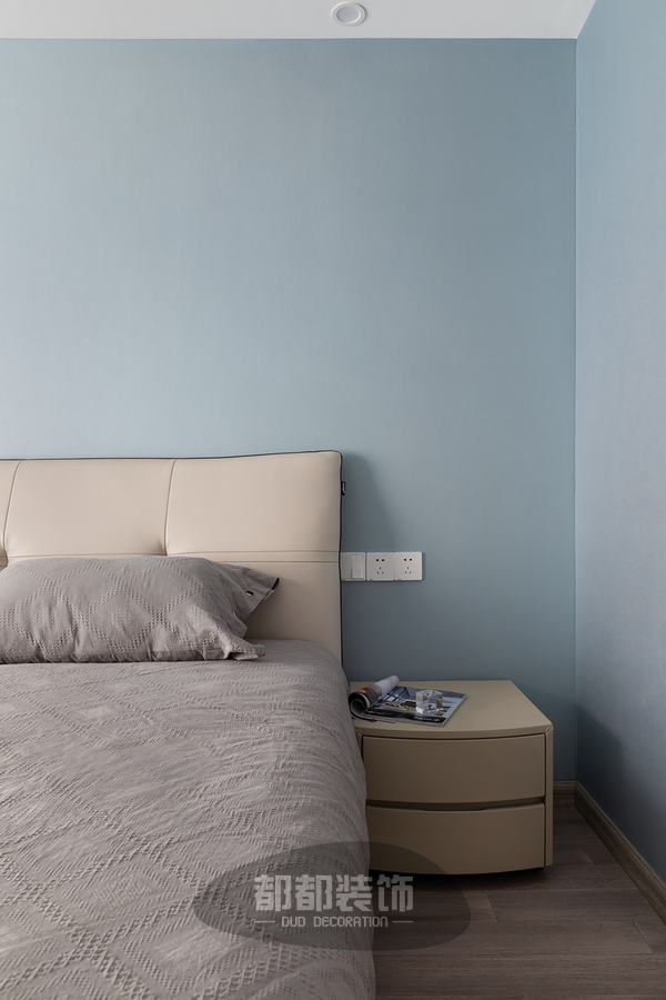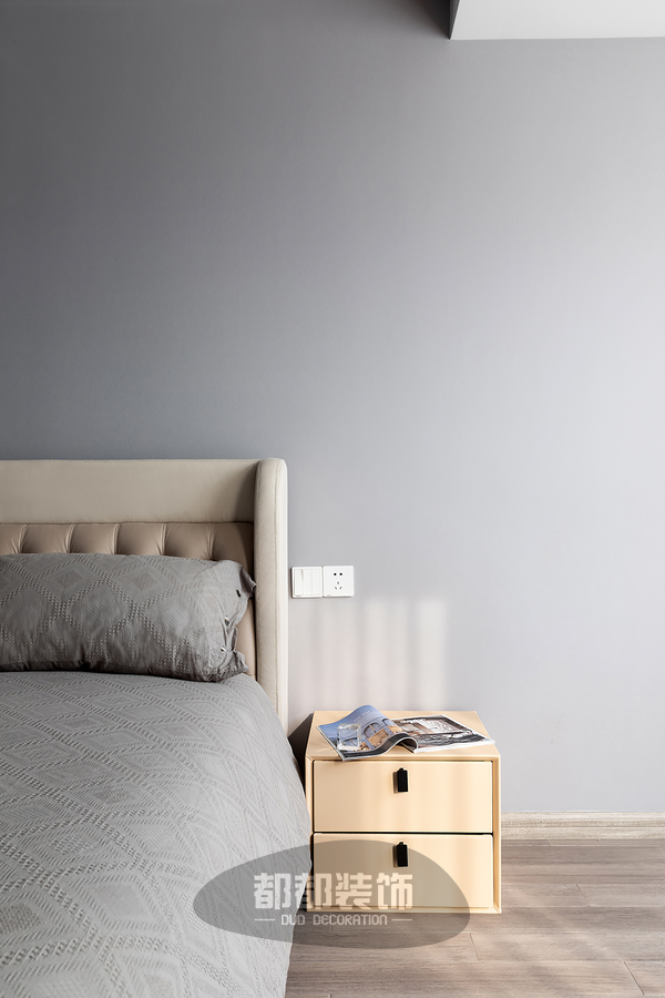 与床头同类型的皮质床头柜上时尚简约,干净利落又不失家的温馨感,柜面上摆放着昨晚睡前随手翻阅的书籍,角角落落都是生活的气息。