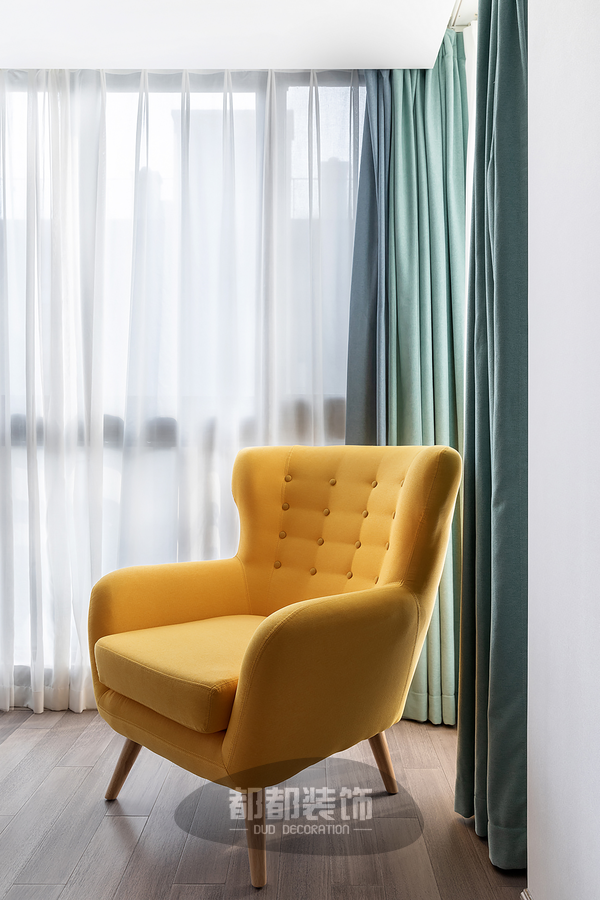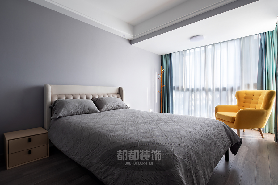 大大的飘窗纳进自然光,尽显温柔无争岁月静好,暖色灯光搭配浅灰色原木地板,呈现明亮温暖的风格样貌,亮橘色的衣架和姜黄单人椅是整体设计中的点睛之笔,增添了现代时髦感。