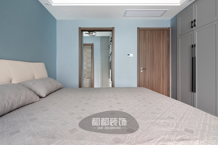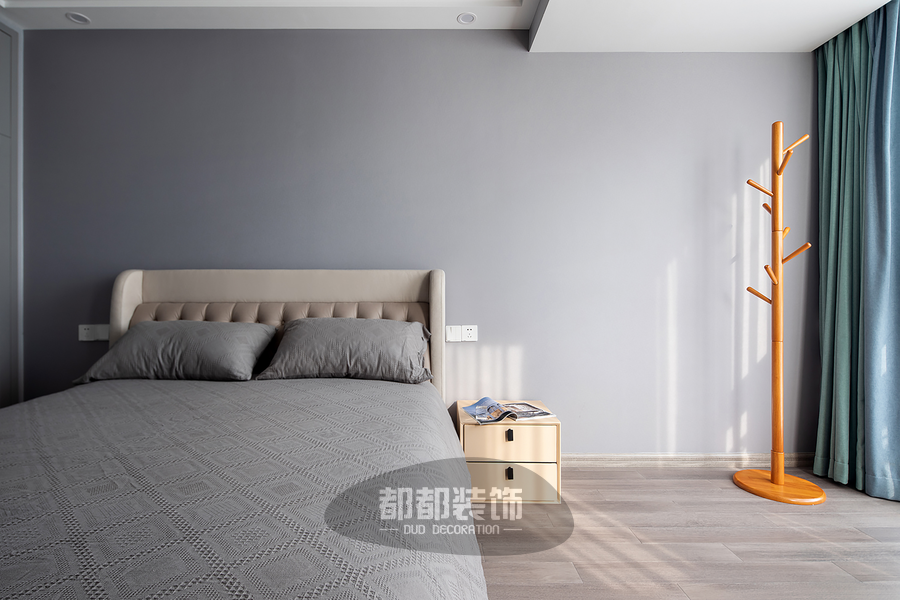 静谧蓝通涂墙面,给人以大海般的平静浪漫,配上自然的原木地板,空间内瞬间有了温度,同样软装的选择上也去繁留简,没有过多的造型和拖沓的软装,太阳光穿透窗帘且洒落一室,带来明净、宽敞的空间感。