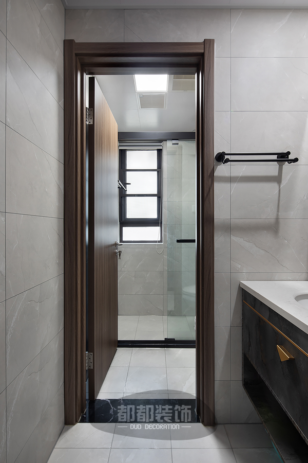 卫生间选择黑白褐三色搭配,简单纯粹,墙面和地面满铺灰色地砖,耐脏好打理,干湿分离是实用主义的首选。