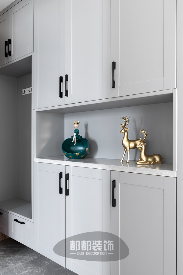 玄关柜采用白色柜门无拉手设计,中间留空加入暖木色点缀,干净利落又不失家的温馨感。