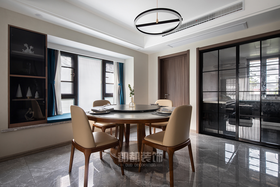 颜色浓度和谐整体的木质和蓝白相间的窗帘让空间质感更加丰富,整个空间的软装克制而高级,咖色实木圆桌搭配四把同类型的餐桌椅,颜色沉稳时尚,蔓延着主人的文艺情怀。