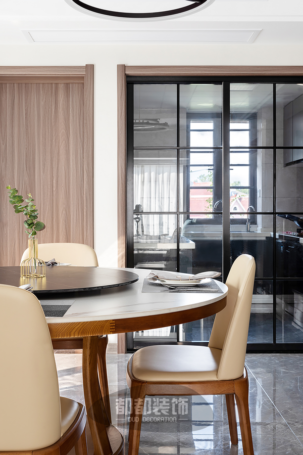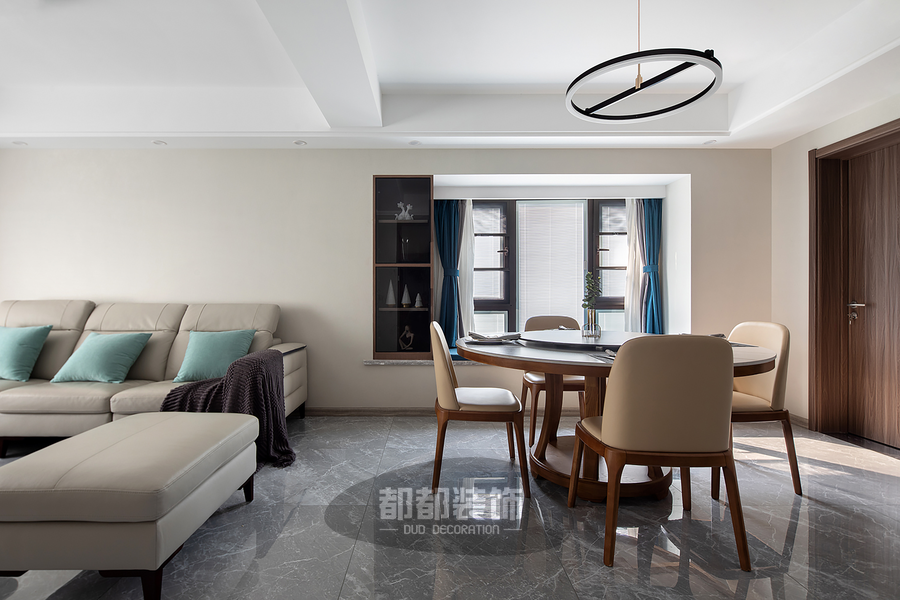 餐厅与客厅保持相近配色,整体搭配很和谐,餐厅背景墙以卡座的形式呈现,打造出轻松愉悦的生活状态,灯、桌、椅、餐边柜、素雅的墙壁,构成含蓄而内敛、简单而安闲的餐厅环境。