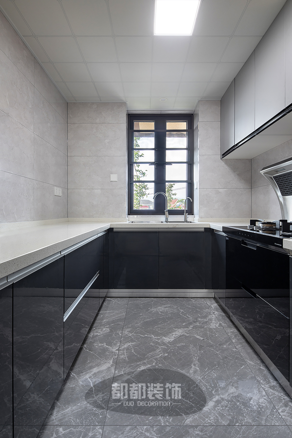U型厨房同样延续黑白灰风格,上下橱柜大大增加储物空间,水槽、洗碗机、蒸烤箱等一应俱全,方便日常烹饪备餐。