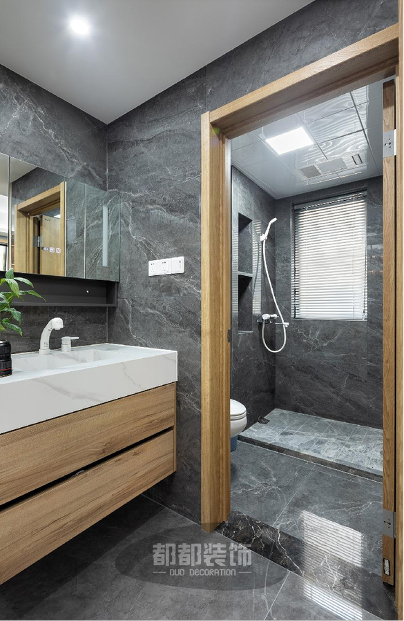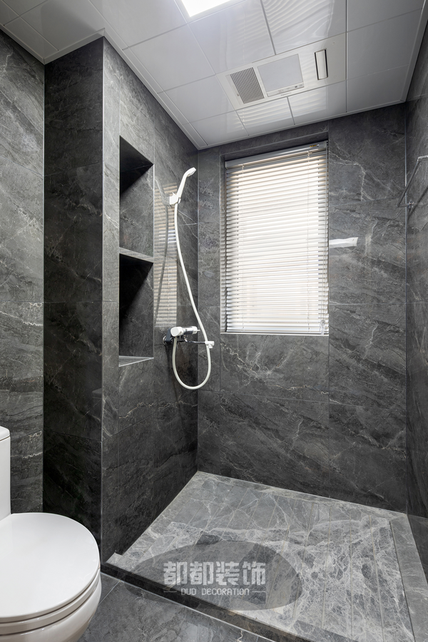 卫生间墙面和地面用瓷砖铺贴,利落干净,简单大方。淋浴是暗藏款,隔断采用一片式无框玻璃隔断,更加简洁时尚,壁龛空间设计合理,用来放置各种洗漱用品,收纳颜值一举两得。