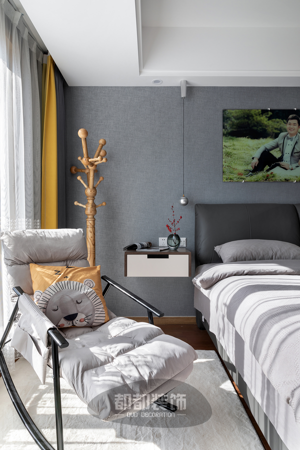 卧室书房一体,充分压榨每一寸的空间,次卧靠墙改造成为带办公桌的一体化设计,一部分用于摆放照片抽屉等,留出一部分作为办工作,增加实用性的同时整体空间感也更有层次感,满足了业主可以工作学习休息一体的愿望。