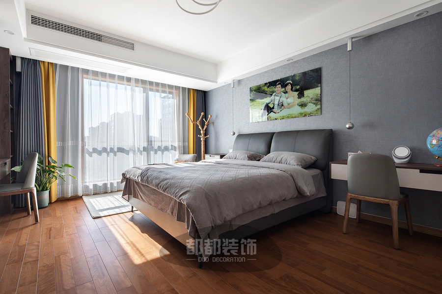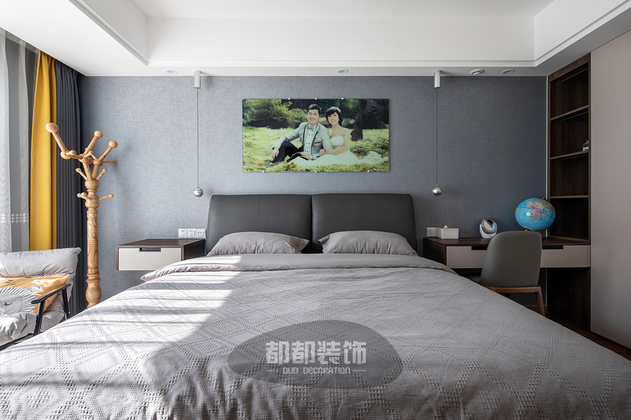 主卧的氛围温馨,绅士灰的墙头背景墙上挂着一幅结婚照,浅灰缎面的床上用品,亲肤又柔软,整个空间都散发出甜蜜浪漫的氛围,配上简洁干净的原木床头柜,让空间显得宁静又优雅。