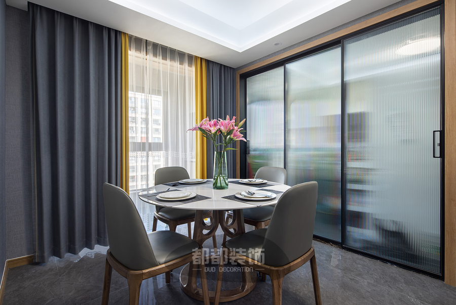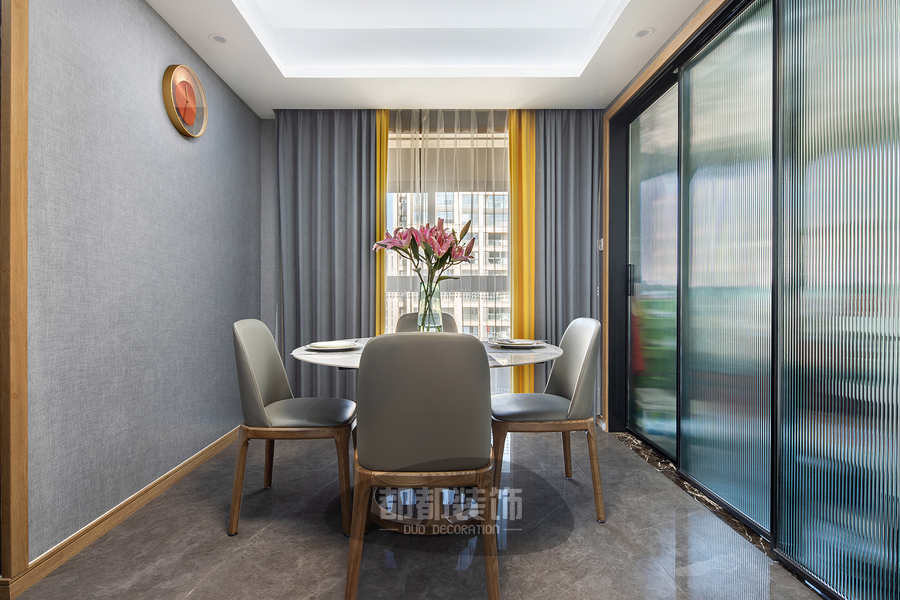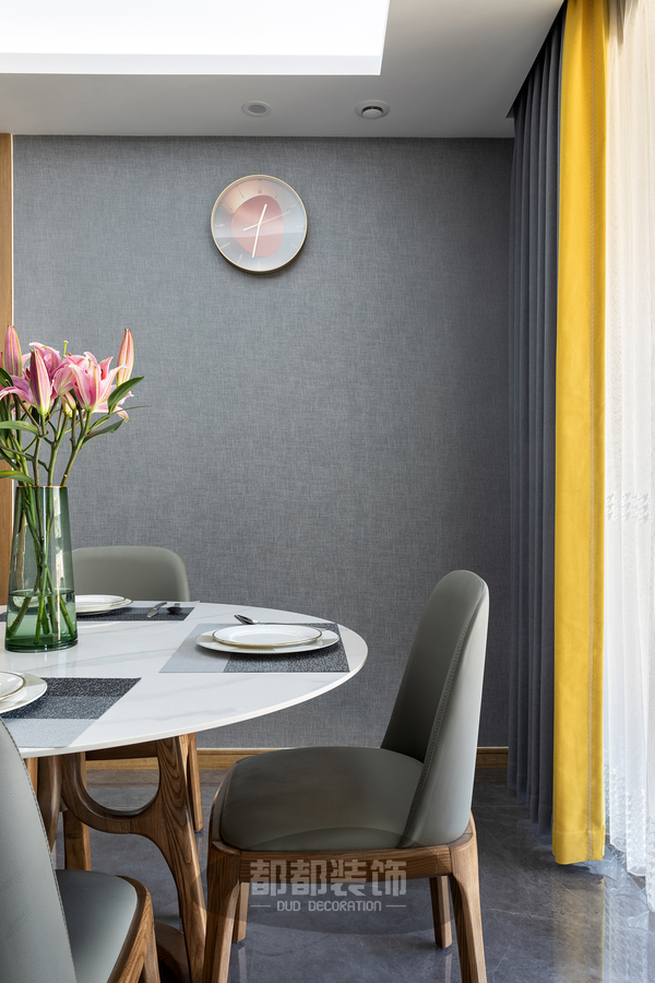 餐厨间隔一道长虹玻璃,美观时尚度up,增强了两空间的互动性。餐厅与客厅配色相似,整体搭配和谐自然,几乎留空的餐厅背景墙,只是用精致小巧的时钟进行了妆点,便轻而易举的大照出轻松愉悦的生活状态,仿佛美好的生活都留在了这一刻。