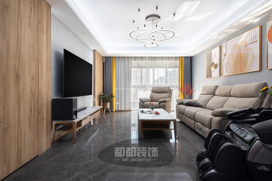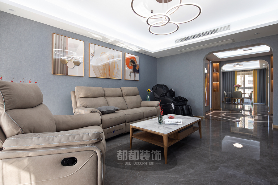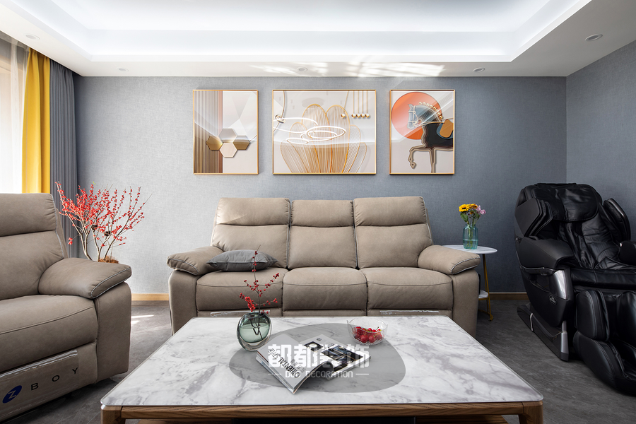 柔和的皮质米色沙发,宽大舒适,点缀以不经意布置的绿植与干花,静谧的空间流畅出一曲活泼明快的小调,随手翻开的杂志,洗净的水果,立在角落的电动按摩椅,充斥着主人对生活无比的赤城,满满的温馨气息。