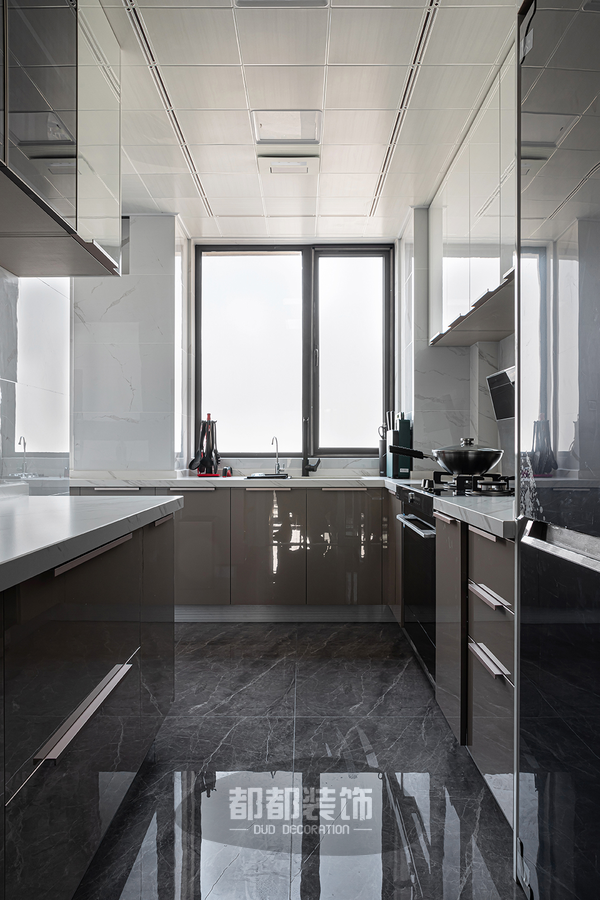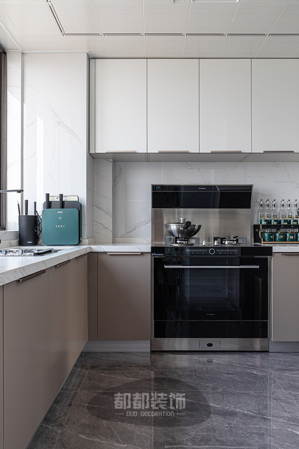 U型厨房同样延续黑白灰风格,上下橱柜大大增加储物空间,水槽、洗碗机、蒸烤箱等一应俱全,方便日常烹饪备餐。