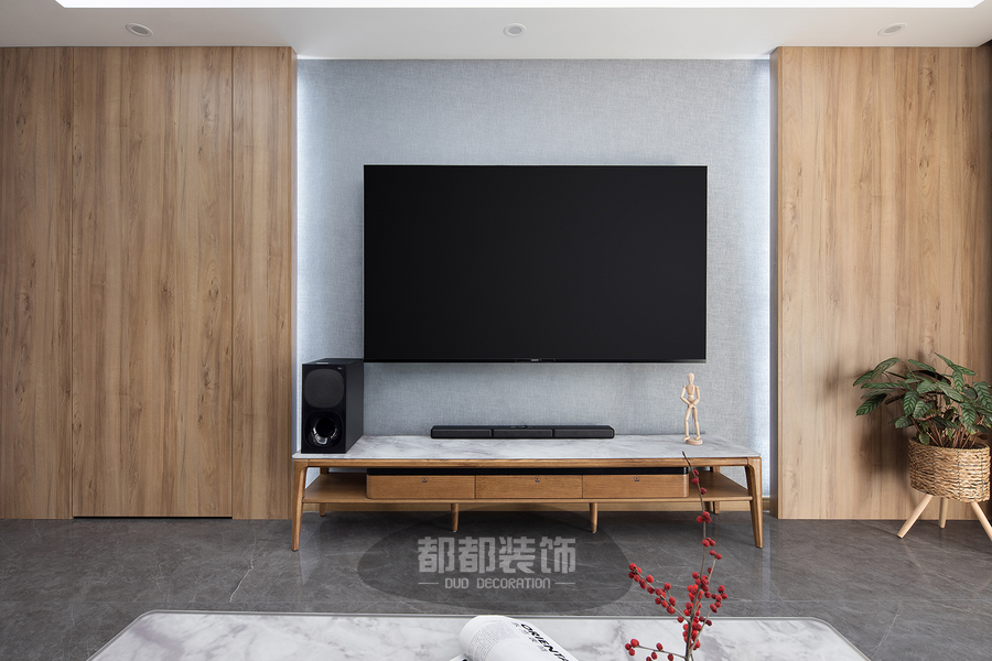 电视墙用浅蓝色系与温馨的实木材质作为混搭,细脚电视柜轻盈优雅,搭配大理石柜面,一冷一热,整个材质的选择丰富而又格调,绿植随意一捧插入藤编的花篮中,温润自然,视线所到之处尽显层次美感,