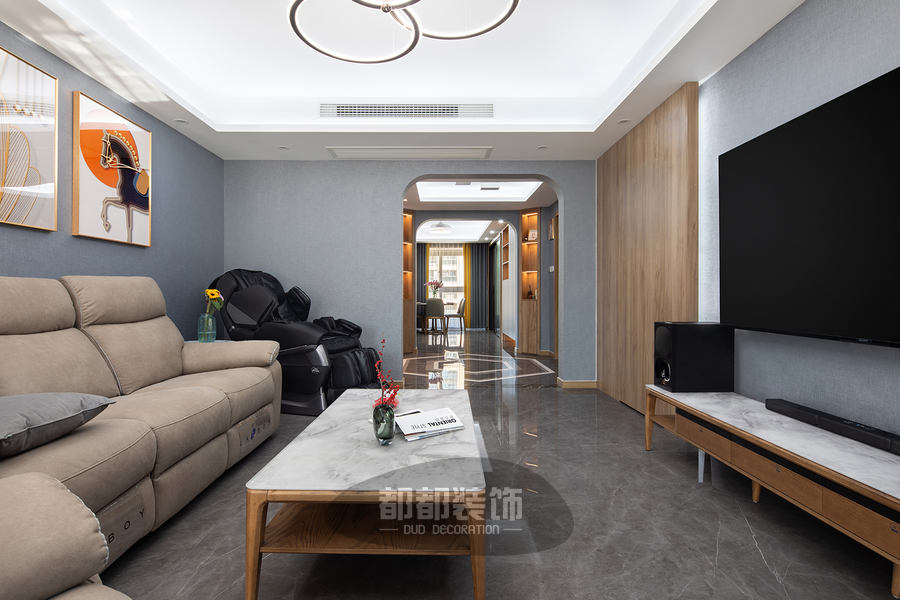 拱形门隔断的的设计,使房间充满设计感和神秘感,空间内部以饱和度低的灰蓝色铺陈,温润自然的原木色与其相得益彰,利落的线条贯通南北,简约大气,呈现出时尚而不失精致的风格样貌。