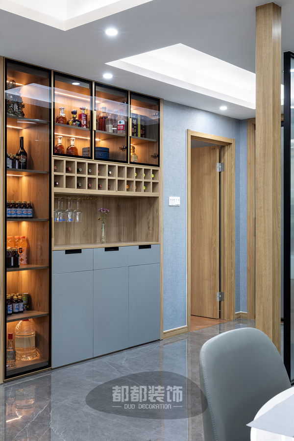 酒柜+餐边柜的不对称组合,彰显出独特的几何感,黑色玻璃门时尚感十足,内嵌隐形灯带,增加视觉效果,让人眼前一亮。