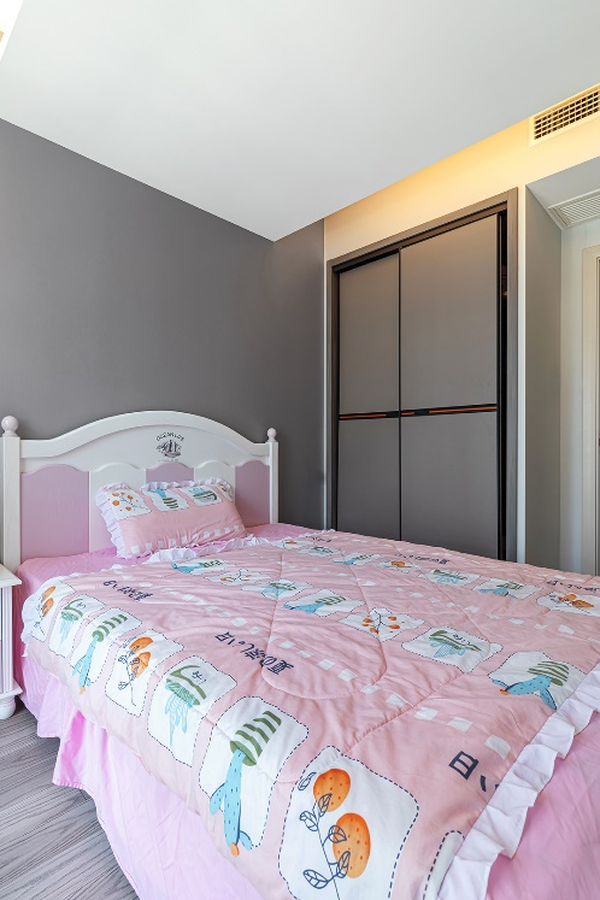 浅灰色墙面、原木地的板搭配很好的压下了床品的浮躁和喧哗,随着孩子的长大,只要替换相应的软装,很轻易能打造出更为高级的空间。暗藏式的灯带,让光线散发的更为柔和。