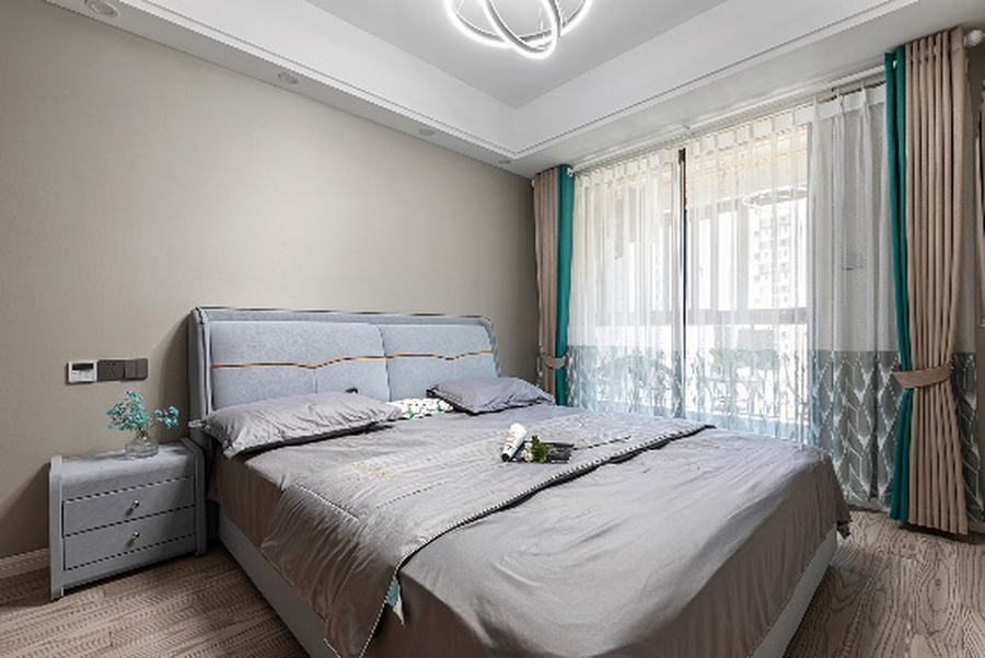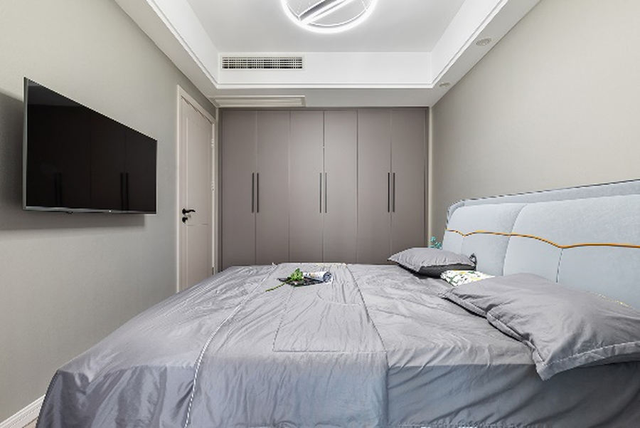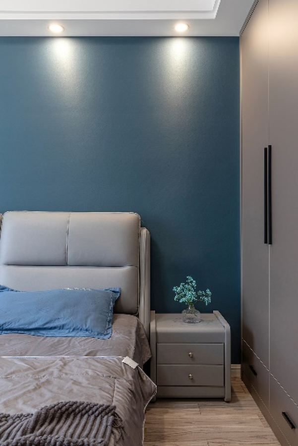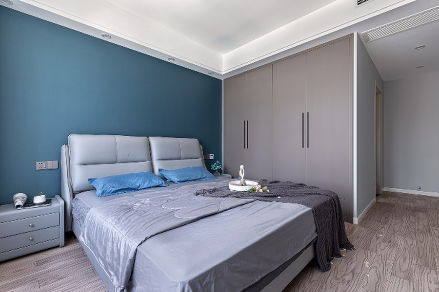 灰色衣柜搭配蓝色皮质双人床,简约大方,处处都可以看到主人对于生活品质的重视。