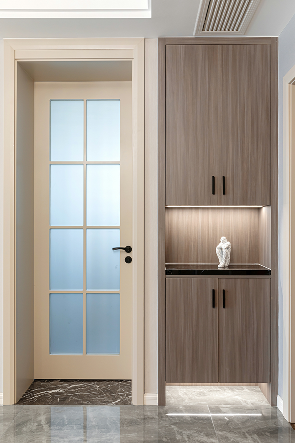 玄关柜嵌入墙体之中,与厨房门形成对称,不显突兀。柜体底部悬空约25厘米,不仅便于打扫,也能基本满足日常鞋子的摆放,而且设计师细心的在底部安装了感应灯带,这样业主回家再也不用面对黑漆漆的家了。