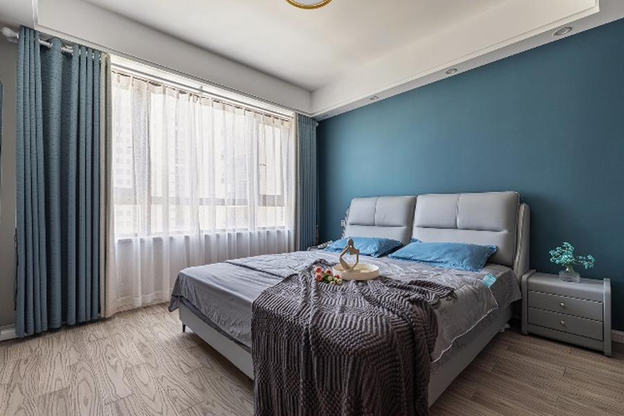 卧室设计以简胜繁,整个空间流淌着深浅不一的蓝色,搭配素雅的实木地板,使空间中洋溢着宁静温暖的气息。