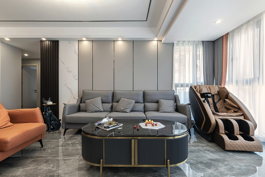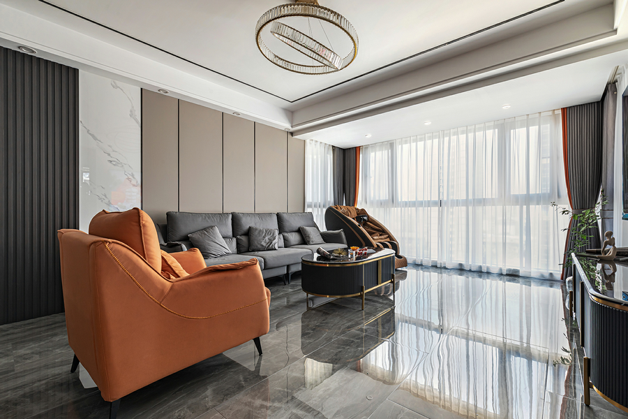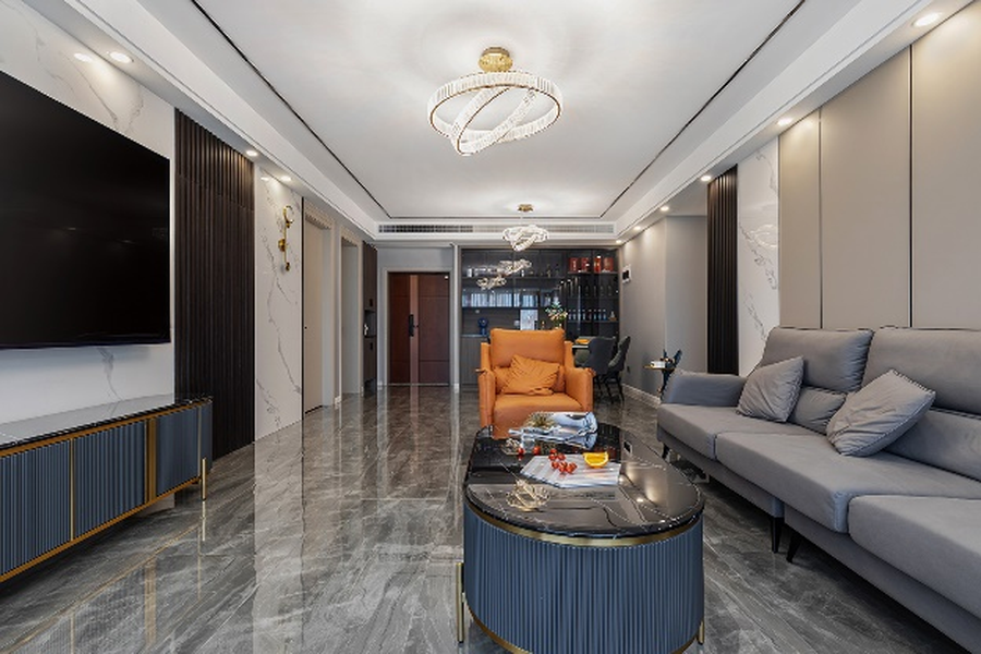 爱马仕橙是奢侈的时代标签,仅一抹亮色便打破空间硬实力的冲击,给予空间舒适和缓,灰色皮质沙发雅致高级,茶几与电视柜相呼应,一切从繁华中释放简约,构建出轻奢的情调氛围。