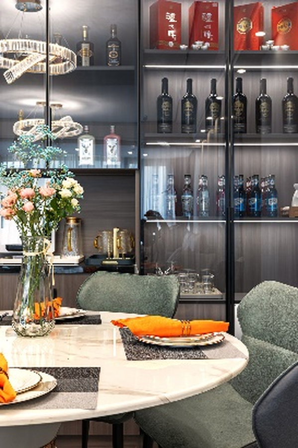 酒柜选用嵌入式玻璃柜样式,把手处以低调磨砂黑包边,玻璃门搭配,通透明亮,当灯带开启,各类精致漂亮的酒器、杯盏都能得以优雅的展示。