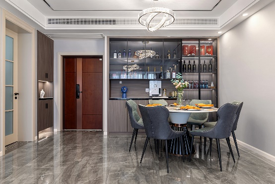 餐厅的一面墙设计成了酒柜,合理利用储物空间,木饰面符合整体风格,贯彻设计语言的流动性和连续性,使客厅、用餐区联合成一个和谐的空间。