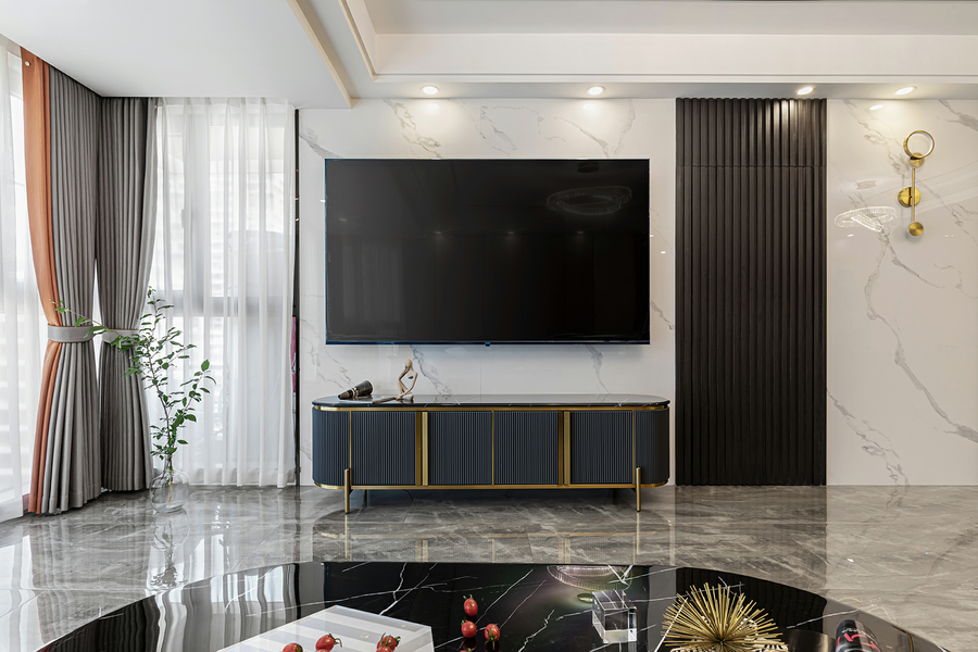 电视背景墙选择了大理石纹和黑钛不锈钢搭配,整体十分稳重且高级,理性的空间不能缺少温度与色彩,设计师巧妙地利用金属色去提亮中性底色,在细节处加上些许跳色点缀,让空间不再单调。