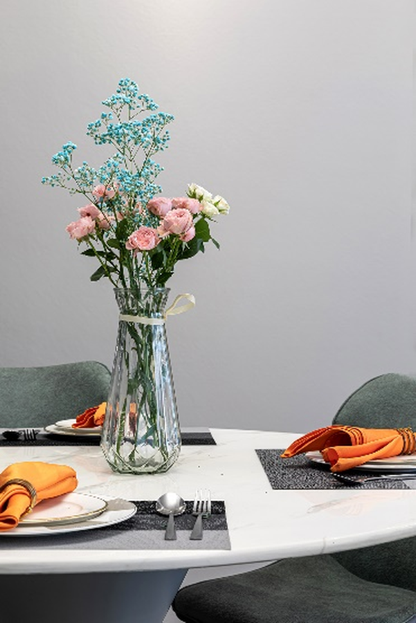 白色大理石纹圆餐桌搭配沉稳高级的灰绿色,细腻的纹路,舒适的布艺,热爱生活的女主人每天替换桌上的绿植,空气中流淌出淡如水的浪漫与优雅。#园餐桌VS长餐桌,哪个好看