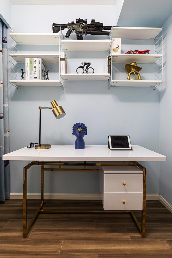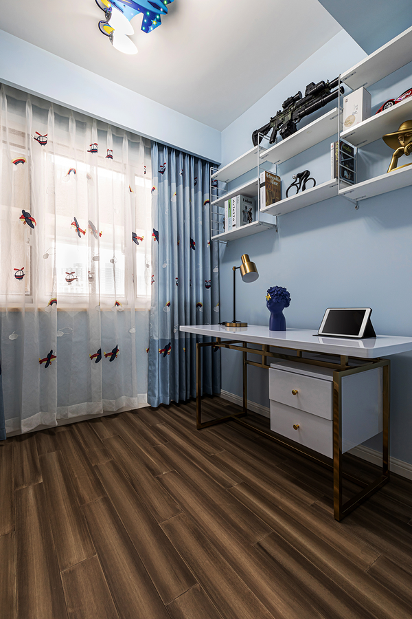 书房主调延续主卧色调,静谧的蓝色,让人心静。刺绣印花窗帘上的小飞机和飞机主灯增添了童趣,散发天马行空的思想。