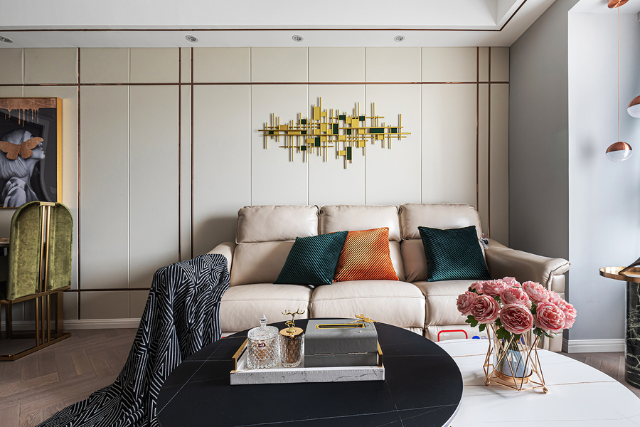 整个空间以象牙白为主色调,温暖有质感,打造平和放松的生活空间,局部点缀藏青、裸粉、棕橘等亮色,与金属、丝绒、玻璃等反光材质,低调中体现出令人惊艳的华丽感。