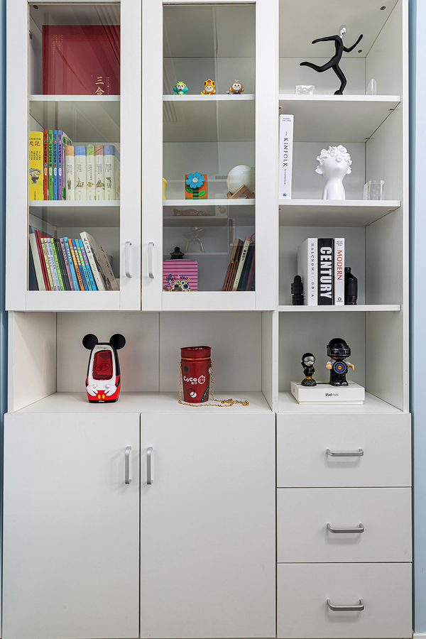 蓝白搭配的大书柜,壁架上墙,用于安置业主小孩子喜欢的书籍和玩具,合理利用每一寸空间;大片的极简留白,柔和的光线,整个房间也变得温暖又有质感。