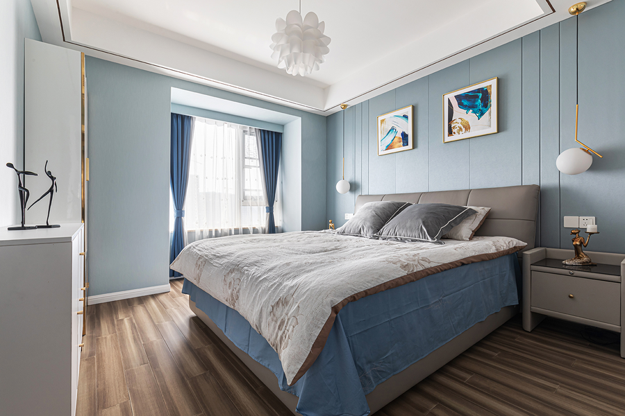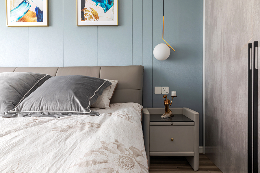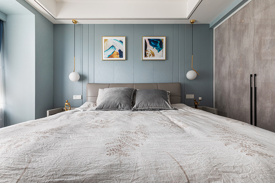 卧室以舒适为主,莫兰迪蓝色清新淡雅,雅致灰衣柜做了毛绒磨砂质感,木质地板自带温润质感,营造出静谧舒适的休憩空间。
