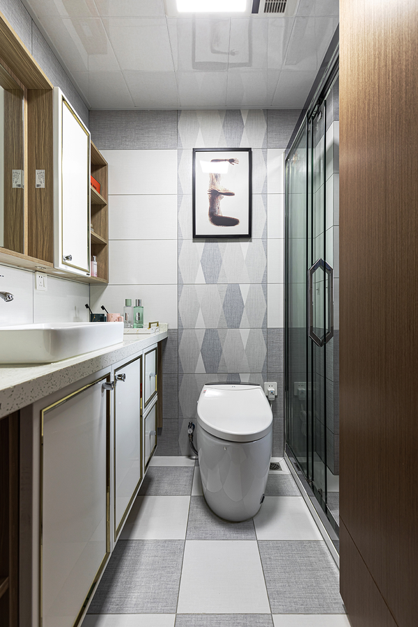 卫生间干湿分离,淋浴区与马桶区并排放置,中间用黑框玻璃做隔断,视觉上更开阔通透灰白搭配的瓷砖铺设,格外清爽干净。
