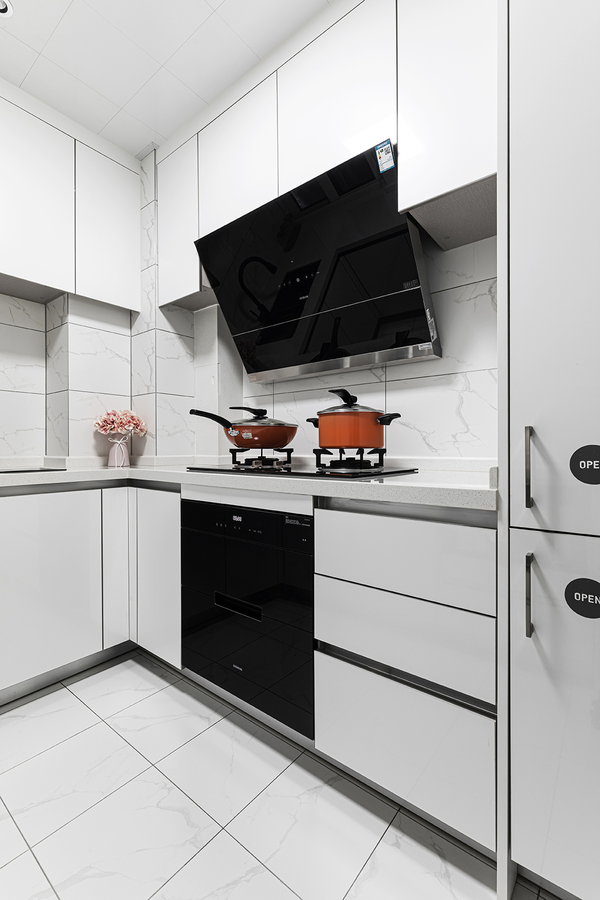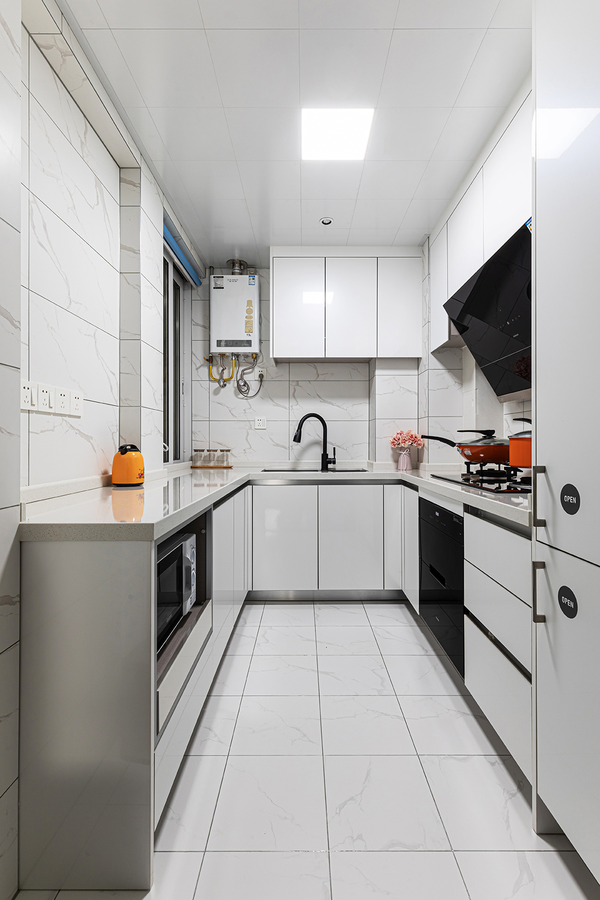 U型格局的厨房设计,分区恰到好处,整体黑白色调为主,看起来简约,但设计却不简单,别有一番韵味。