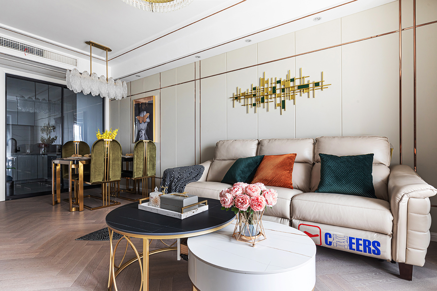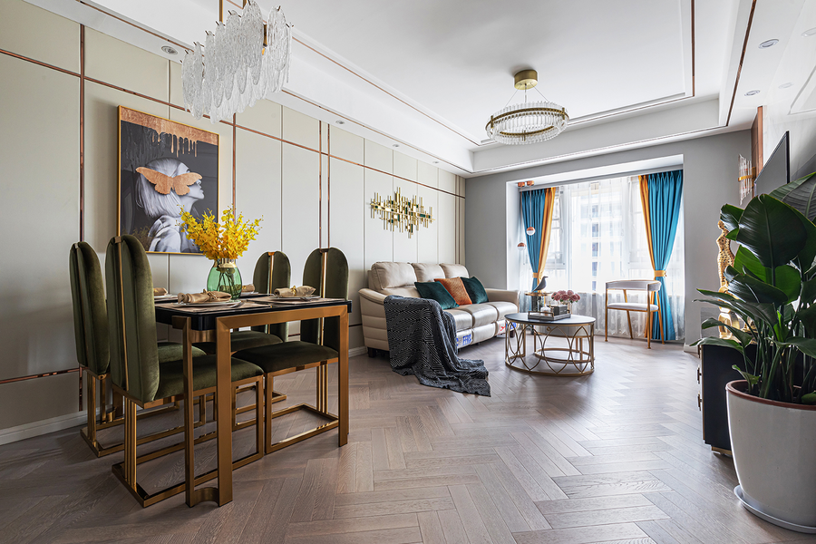 客餐厅一体化,宽敞通透,利用新现代主义设计手法,巧妙糅合空间、文化与生活艺术,打造出一个现代时尚的轻奢空间,彰显奢华内敛的气度。
