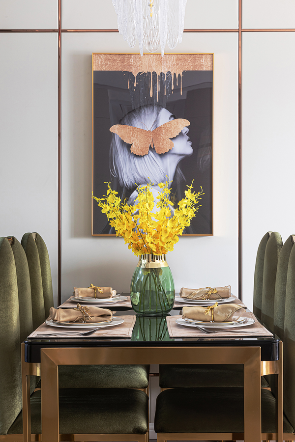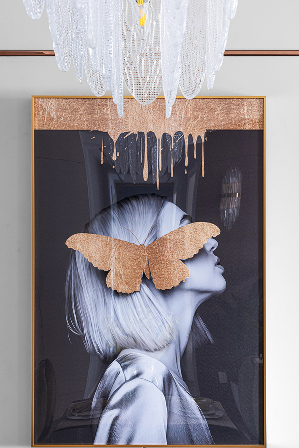 蝴蝶女孩挂画热烈且神秘,亮眼的黄色装饰花束起了点睛之笔,营造出时尚精致的家居氛围。